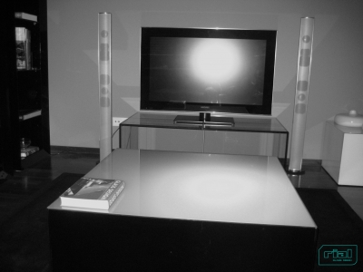 Mesa de apoio de sofá em vidro preto com retro-iluminação.