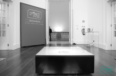 Mesa de apoio retro-iluminada. Exterior em vidro float colorido, de 4mm de espessura com aresta/chanfre a 45º, colagem UV. Tampo amovível em vidro laminado translúcido de 10mm de espessura. Interior em MDF lacado a branco.