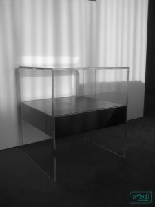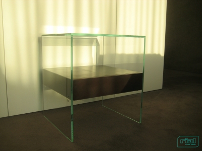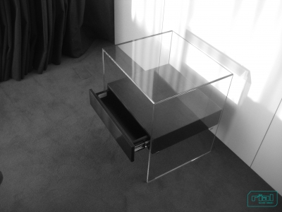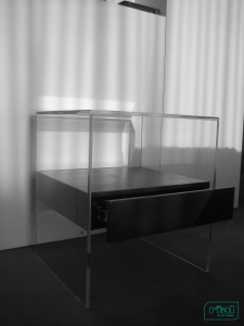 Mesas de apoio em vidro incolor com uma gaveta suspensa em espelho. Vidro incolor de 12mm de espessura, com aresta/chanfre a 45º e colagens a UV. Gaveta em MDF lacado a preto com exterior forrado a espelho de 4mm de espessura, com aresta/chanfre a 45º. Gaveta suspensa em quatro peças metálicas coladas a UV no vidro.