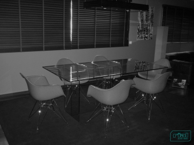 Mesa de jantar em vidro float incolor, temperado de 12mm de espessura com colagens a UV.