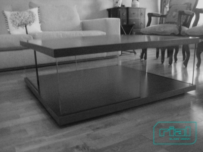 Mesas de apoio / centro composta por base e tampo em folha de cerejeira e quatro pés "desencontrados" em vidro incolor de 12mm de espessura, temperado.