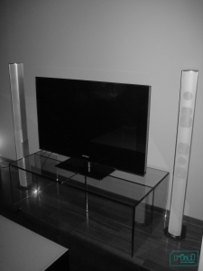 Consola de LCD em vidro float incolor, temperado de 12mm de espessura com aresta/chanfre a 45º, colagem UV.