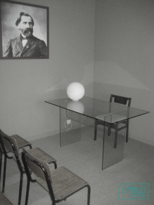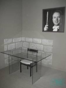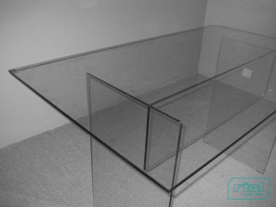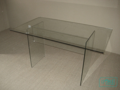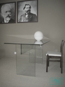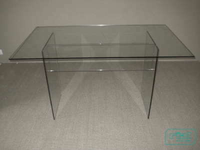 Secretária de trabalho em vidro float incolor, temperado de 10mm de espessura, com colagens a UV. Meia costa em vidro.