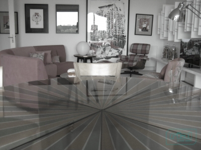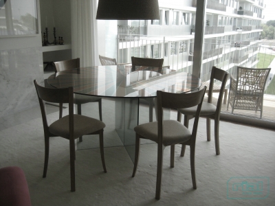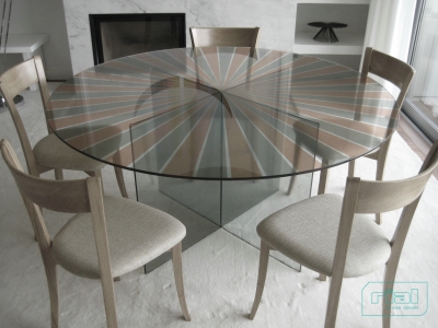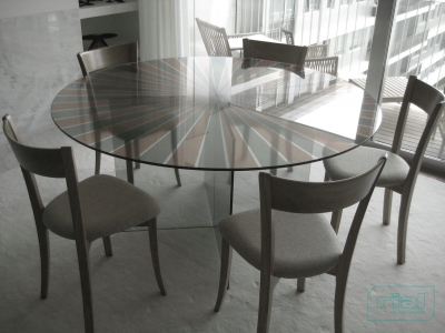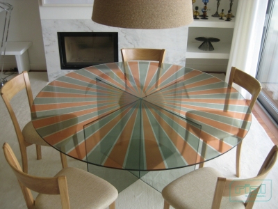 Mesa de jantar em vidro float incolor, temperado de 12mm de espessura com aplicação de película colorida e impressão digital. Colagens a UV.