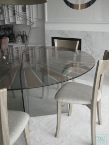 Mesa de jantar redonda, totalmente produzida em vidro.