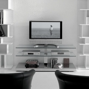 Consola de LCD composta por tampo e prateleira em vidro e base em MDF lacado. Apoios em tubo de aço-inox. Vidro incolor de 10mm de espessura, temperado.