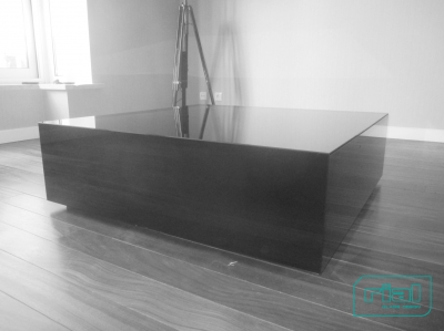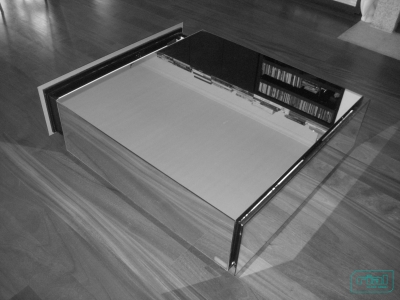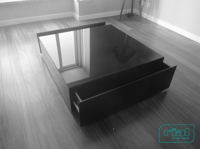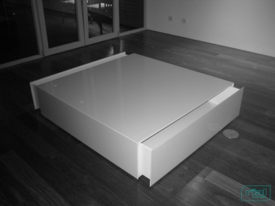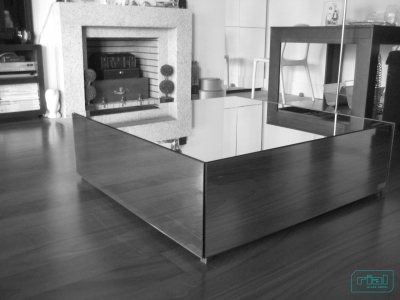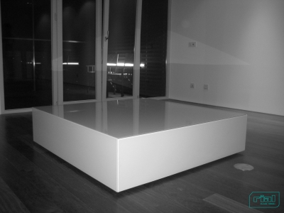 Mesa de apoio / centro de sofá, com dois gavetões, forrada a vidro branco de 4mm. Estrutura em MDF de 16mm, com gavetas de funcionamento oposto e sistema de abertura tic-tac. Interior, gavetas e fundo lacado a branco mate.