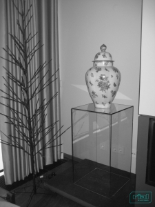 Coluna / plinto em vidro float incolor, temperado de 8mm de espessura, com aresta/chanfre a 45º e colagens a UV.