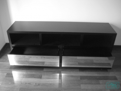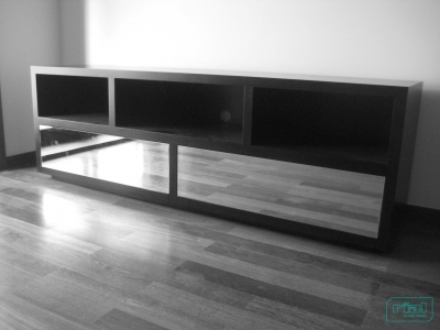 Consola de LCD composta por base de madeira com folha de carvalho com três divisórias e duas gavetas. Frente das gavetas em espelho.