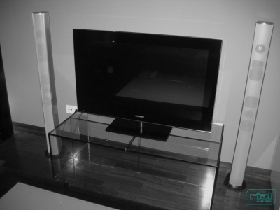 Consola de LCD em vidro float incolor, temperado de 12mm de espessura com aresta/chanfre a 45º, colagem UV.