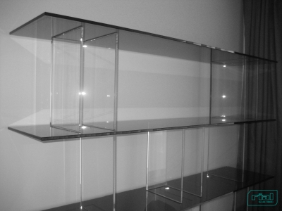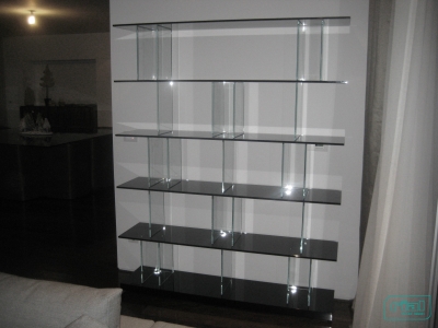 Estante em vidro temperado de 10mm, composta por cinco prateliras em vidro transparente cinza e bases de apoio em forma de "U" em vidro extra-claro. Acabamento com aresta/chanfre a 45º e colagens a UV. Base de apoio em MDF lacado a preto alto-brilho.