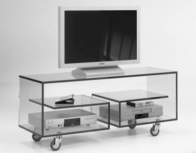 Consola para LCD em vidro float incolor, temperado de 10mm de espessura com aresta/chanfre a 45º, colagem UV. Quatro rodas metálicas estilo industrial coladas ao vidro através de patela cilíndrica em aço-inox.