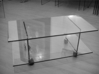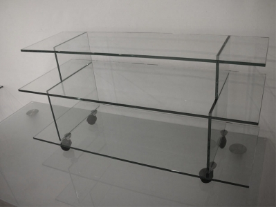 Consola para LCD em vidro float incolor, temperado de 10mm de espessura com colagens a UV. Quatro rodas metálicas estilo industrial coladas ao vidro através de patela cilíndrica em aço-inox.