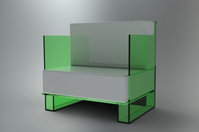 Poltrona em vidro float de 12mm de espessura, com estofo em tecido.