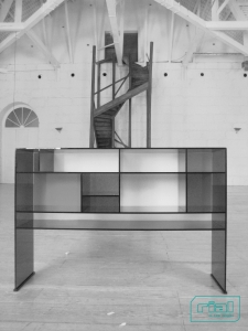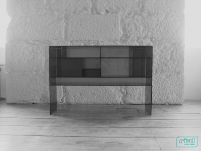Consola / Sideboard em vidro transparente cinza, com costas em vidro colorido, temperado de 10mm de espessura com aresta/chanfre a 45º, colagem UV.