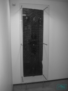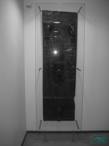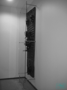 Expositor / resguardo de suspensão em vidro, para obras de arte.