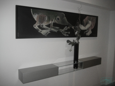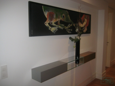 Consola composta por três modulos. Dois modulos com gaveta e acabamento lacado e modulo central em vidro incolor de 10mm de espessura.